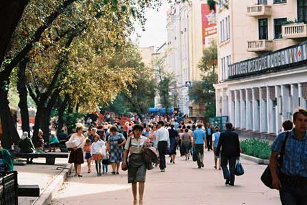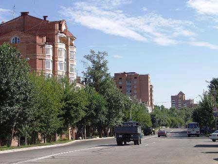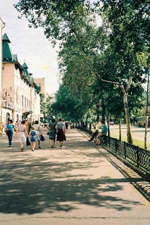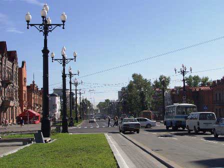 この写真は2002年の夏に撮影したハバロフスク市内の2つの通り。どちらも中心部の主要な通りなのだが、それにしても前のページとはちょっと雰囲気が違うと感じられないだろうか。極東のこの地でも近代化が進んで来ているのが通りの景観の変化からうかがえる。 (2002年8月撮影)