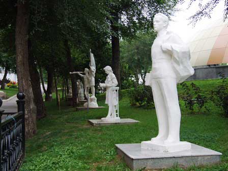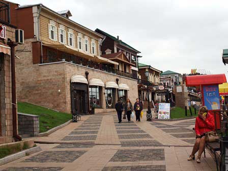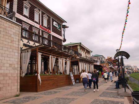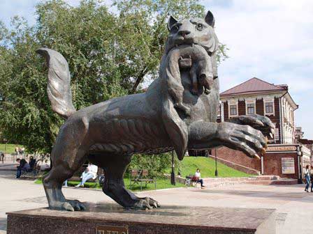 近代化・現代化の象徴と言えばここと言えるかもしれない。何という通りなのか、その名前がわからないが、文化と休息の公園にほど近い坂道のあたりにお洒落な飲食店等が立ち並んでいる。モールの入り口にあるテンを加えた虎だか何かはイルクーツク市のシンボル。ただ、この像、後ろ足だけで立っている! ペテルブルクの「青銅の騎士」像(馬に乗ったピョートルI世像)も馬の後ろ足だけで立っているけど、構造設計としてはこちらのほうが難しかったのではという気がするんだけど。 (2016年8月撮影)
