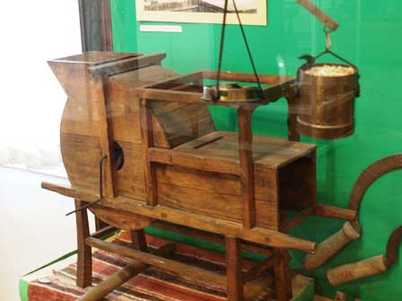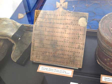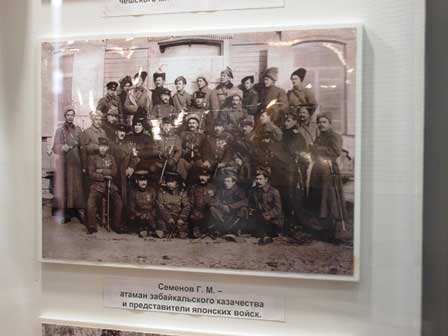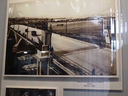 2段目中央の展示品は、19世紀に農民が使っていた木製のカレンダー。3段目左は、日本の稲作農家がかつて使っていた唐箕に似ている気がしてならない。説明文が全部ロシア語だったから、ほんとうのところはわからないが、何なのだろう?同じく中は、十月革命後日本が干渉軍を送ってシベリアの奥深くまで入り込んだ時期に、セミヨーノフというザバイカル・コサックの首領が日本軍の代表者と会見した時の写真。さらにその右は、初めてアンガラ川に架けた橋の工事風景。 (最上段:2001年3月、2,3段目:2016年8月撮影)