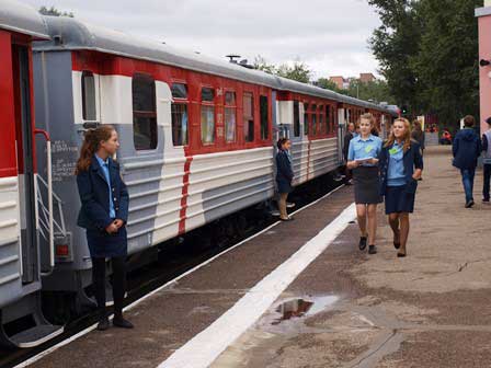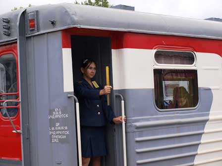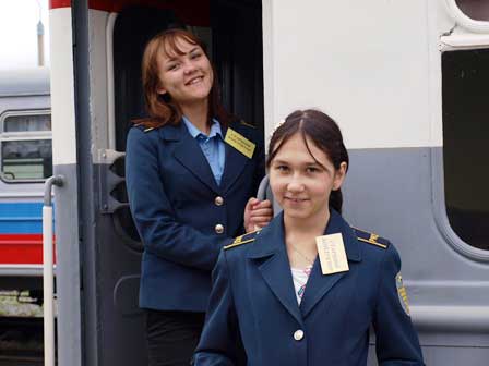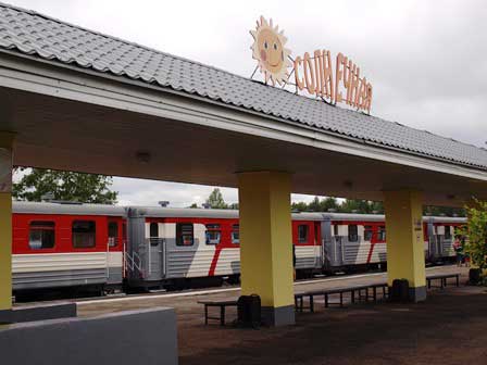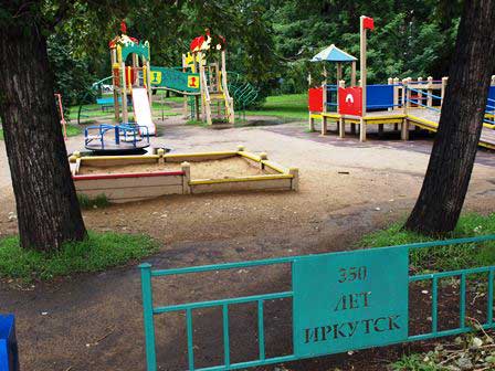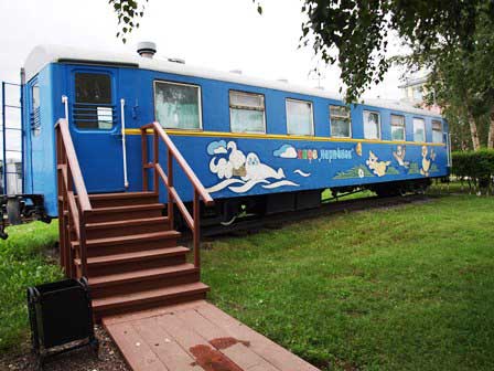 ロシア各地にある子ども鉄道は、決して「子ども騙し」ではなく、たいてい本格的なものだが、ここイルクーツクのも、プラットホームを備えた駅があって、列車がお客を乗せてちゃんと運行する。停車時に各車両の出入口に車掌が立ってお客の切符を改めるのも、列車が始動する時には黄色の旗だか竿だかを立ててデッキで直立し続けるのも本物と同じ。ただし、蒸気機関車はおそらく動態保存はされていなくて、ただの展示品だろう。また、駅舎からちょっとだけ離れた所に置かれた青い客車は「あざらし」という名前のビュッフェだが、営業しているかどうかは確かめなかった。 (2016年8月撮影)