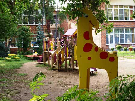 市内で見かけた幼稚園。中央の写真は左の写真の幼稚園の園庭だが、右の園庭は、離れたところにある全く別の幼稚園の。 (2016年8月撮影)