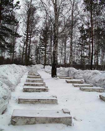 市内にある被抑留日本人の墓地。墨で慰霊の言葉を書いた木柱が1本立っているだけで、それ以外はこうやって低い墓が広がるだけ。 (2001年3月撮影)