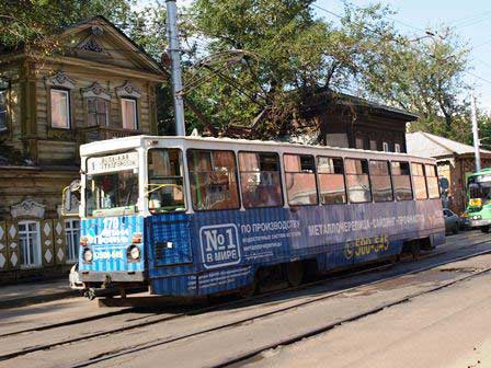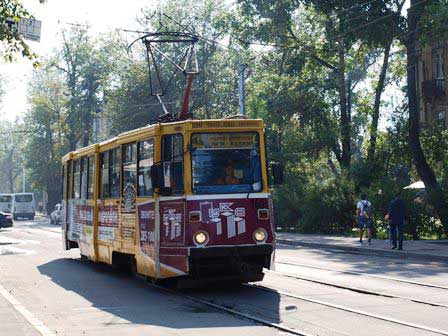 市内で今なお縦横に活躍する市電。塗装が統一されておらず、スポンサーのご意向によって如何様にもという感じだ。 (2016年8月撮影)