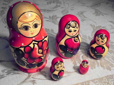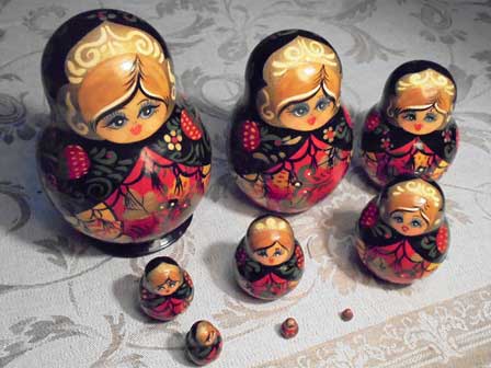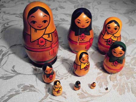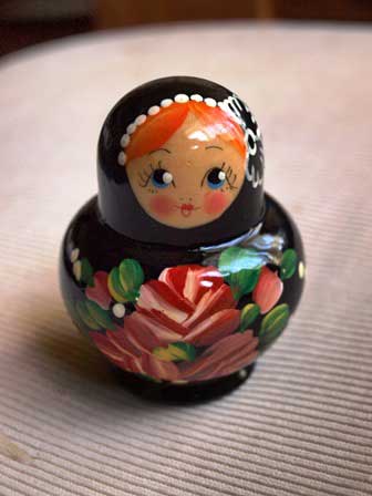 ロシアへ行ったときの最も手頃なお土産と言えばこのマトリョーシカだろう。原型は日本の箱根の七福神だという説もある。入れ子人形で、あけてもあけても中から小さな人形が出てくるのが楽しい。右の写真は私が初めてソ連へ行った1979年に買い求めたもので、工場で大量生産された同じ表情のものが全国の「ベリョースカ」と呼ばれる外貨ショップにならんでいた。しかし、いちばん内側の最も小さいものは米粒より小さく、ソ連にしてはなかなか芸が細かいと感心したものだ。