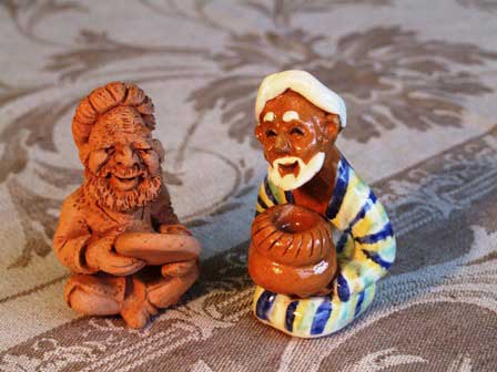 パンを持つお爺さんの人形。左は素焼きで、右は陶器。