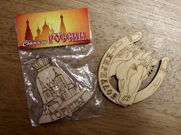 ソロフキへの船旅で同乗していた姉弟からもらったお土産。木片の裏にマグネットがついていて、冷蔵庫の側面にメモの紙片を貼り付けたりするのに使う。