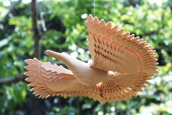 森の民でもあるロシアの人々は生活のいろいろな場面で木の製品を多用する。玩具にも木製のものが多い。写真はレニングラード郊外パブロフスクで知り合いになったアルハンゲリスク在住の少女カーチャから贈られたもの。翼を広げた鶴の形なのだが、どう見ても細かな細工をした翼の部分と胴体とを接着剤等でつなげた跡は見あたらず、もともと一つの木片から作り上げたもののようだ。