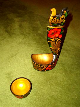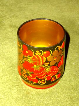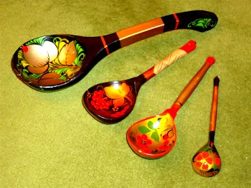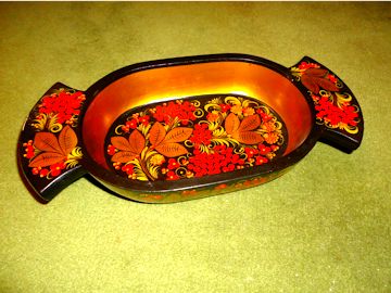 木製の道具類や玩具の多いロシアで塗りものが発展したのは必然だったかもしれない。写真はホフロマと呼ばれる種類の彩色木製食器。金や赤,黒などで豪華に飾り立てられている。