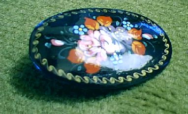 パレフではないが、木の台の上に塗りで描いたブローチ。