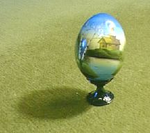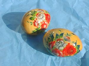 木製の卵に彩色を施したもの。復活祭に使うのであろうか。右は土産物店で私自身が買ったもの。マトリョーシカと同じ技法で描かれているように思われる。価格はとても安かった。左はスタンドまで付いていて、右のよりもずっと高級感がある。こちらは知人から贈られたもの。