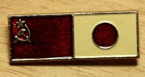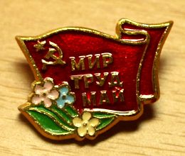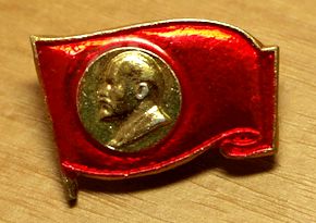 ゴルバチョフ登場以前のソ連では、国家や党の最高幹部がたくさんの勲章を着けて公式の場に出る姿がよく報道されたものであった。また「ベテラン」とよばれる退役軍人もよく勲章を胸につけて外出した。そのせいかどうかは知らないが、勲章ならぬバッジなら、当時はいたるところで手に入れることが可能であった。左は外国人向けの土産店にも大量にあった赤旗を背景にレーニンの肖像をデザインしたバッジ。在庫が大量なのと価額が安かったので貧乏旅行する学生などが「ソ連に行ってきたよ」という証拠がわりの土産にするにはもっとも適していた。