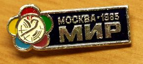 いろいろな行事の折りにも記念のバッジが作られた。左上はメーデーのバッジ。右は1985年にモスクワで開かれた第12回世界青年学生平和友好祭の記念バッジ。