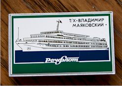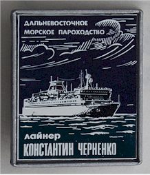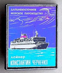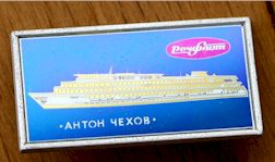 船に乗ると船内の売店には乗船記念のバッジが売られていた。右側の「コンスタンチン・チェルネンコ」という船は横浜〜ナホトカ航路の船。左側の2つはレチフロートに属する河川用の客船。これらのバッジにはいずれも光線のあたる向きによってはきれいな色が出るような仕掛けが施されていた。右の2枚は同じバッジなのに、まるで夜と昼の航行のような印象ではないか。