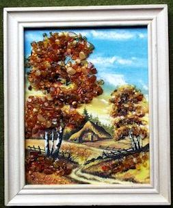 砂ではなくもう少し大粒の石を貼り付けた絵。えっ、どこに貼ってあるかって?色づいた白樺の葉が石でできている。ロシアの人たちは、孔雀石のような高価なものでなくても、こうした美しい色のついた石を生活の様々な場面で上手に利用している。