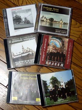 音楽の国ロシアだからCDなどをあらためて紹介するのもどうかと思うが、これは「ご当地CD」。教会や修道院や遺跡を見学すると、その建物の内外でコーラスや重唱を披露してくれることがしばしばある。終わると必ずと言っていいほどCDやテープ(最近ではテープは見なくなった)を勧められ、私はたいてい買ってくる。