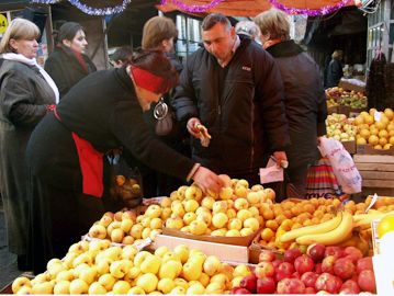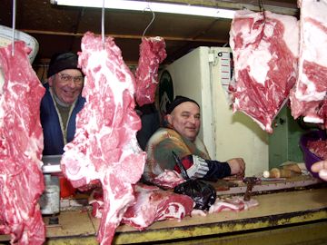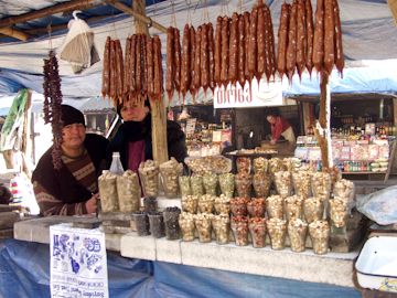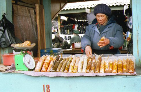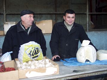 グルジアのトビリシからカヘチアに向かう幹線道路沿いのやや大きな村の中心部にあった市場の露店。お正月用の食べ物を商っていた。 (2004年12月撮影)