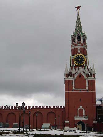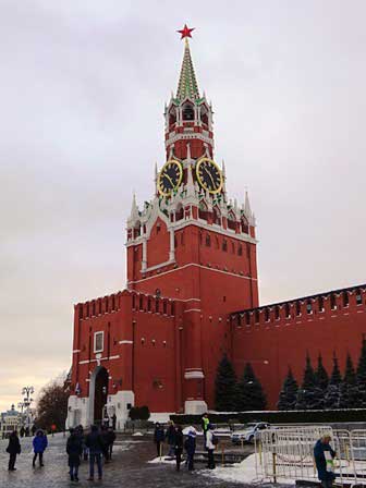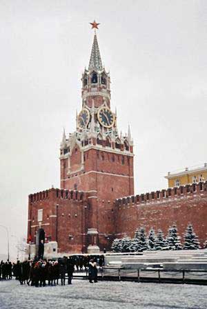 モスクワ・クレムリンの壁にはいくつもの塔が立ち並ぶが、その中で唯一時計の付いたスパスカヤ塔。 (左:1982年12月,右:2017年1月撮影)