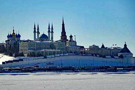 同じくボルガ河畔の町カザンのクレムリン。カザンはタタール人によってつくられた町で、中世にはカザン汗国の首都であったが、その後イワン雷帝によって征服された。上段左の写真はクレムリンの敷地の中にある教会の屋根。上右の写真はクレムリン内部から見た城門の一つ。下段左は城壁。下右はクレムリンの遠景。 (上段左右:1995年8月,下段左:1997年8月,同右:2019年3月撮影)