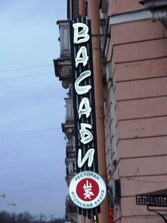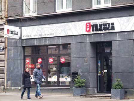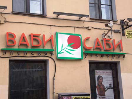 写真は、日本食レストランの看板。店名が「わさび」ぐらいなら許せるけど、「わび(侘)」とか「さび(寂)」とかは店の名としてどうなのかという気もする。もっとも先方にとっては、山葵も侘寂も似たようなものかもしれない。しかし、リガ市内で見かけた右の写真「ヤクザ」という店名は、いくらなんでも行き過ぎだろうに。 (左及び中:2011年12月,右:2014年3月撮影)前のページへ 次のページへ 目次へ戻る