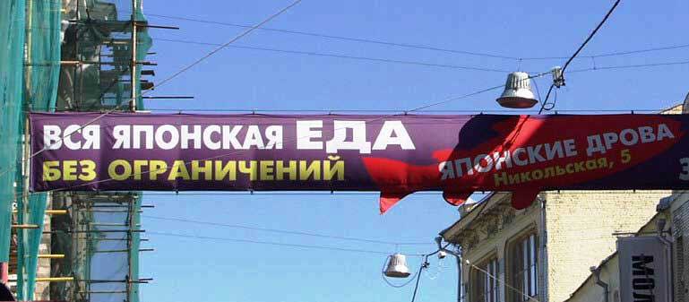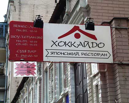 ソ連時代、あちらにある日本料理店と言えば、モスクワのメジュドゥナロードナヤ・ホテルにあるめちゃくちゃ値段の高いお店ぐらいだったが、今や首都などではブームとも言えるくらい日本料理店が増えているのだそうだ。 (左:2003年8月撮影・キエフ市内 右:2005年8月撮影・モスクワ市内)