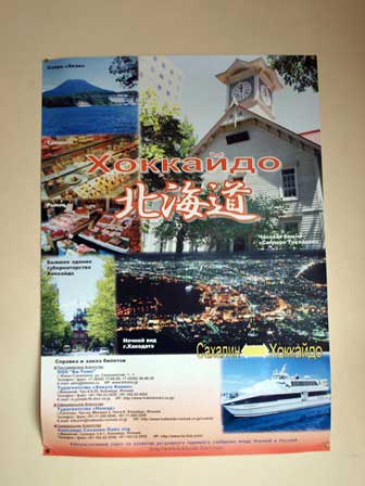 ユジノ・サハリンスク市内のある建物内部の壁に貼られていたポスター。サハリンと北海道は、ほんとうにお隣どうしだから、ちょうど韓国と日本との間を多くの人が行き来するようにこちらもなったらいいのにと思う。その“お隣”へ誘っている。 (2019年8月撮影)