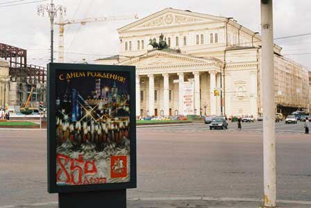 1997年秋にモスクワは市創立850年ということで盛大な祝典があった。その年の夏にモスクワを訪れたところ、市内の至るところにそれを祝う横断幕や看板が掲げられいた。写真はボリショイ劇場前の通りの歩道に出されたその種の看板。 (1997年8月撮影)