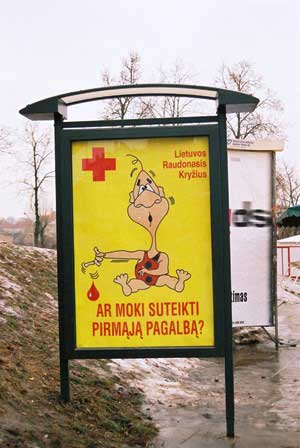 独立を果たした首都ビリニュスの通りで見かけたリトアニア赤十字社の看板。言葉がまったくわからないので、内容は不明。献血を呼びかけているのか、エイズの警告をしているのか、はたまた....。 (1998年12月撮影)