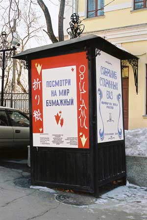 よく「片思い」と言われるが、日本人の対露感情があまり良くないのに、先方の対日感情はそんなに悪いものではない。さきの大戦の敗戦国で、戦争によってソ連同様の経済の壊滅を経験しながら驚異的な復興を遂げたことへの「畏敬」もあるし、エキゾチックな東洋文化への憧れもあって、日本への関心も少なくない。左の写真はハバロフスク市内の美術館の前に出された折り紙展の看板。「紙」の字が少し怪しいけど、私が話すロシア語のでたらめさに比べればはるかに立派なものだ。右はモスクワ動物園構内で見かけた盆栽展の広告。上方はロシア国旗をベースにしたデザインだということがすぐにわかるけど、下方はもしかして日の丸?? (左1999年3月,右同年12月撮影)