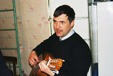 上の会場に案内してくれたガイドのミーシャさん。その前日の夜はご自身の自宅に招いてくださって、ギターを弾きながらの歌で歓迎された。 (2001年3月撮影)