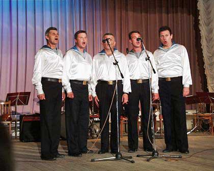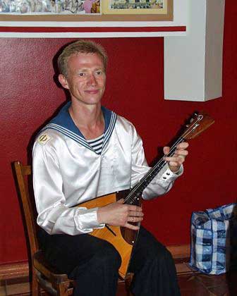 ロシア黒海艦隊の将兵と軍艦がウクライナの軍港セワストーポリに駐留している。その隊内にある「歌と踊りのアンサンブル」の公演の模様。右の写真は、終演後にロビーで写真撮影に応じる隊のバラライカ奏者。 (2003年8月撮影)
