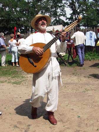 ドニエプル川沿いの町ザポロージェは、古くはコサックの根拠地の一つであった。そのコサック伝統の馬術を披露する観光施設で、余興に民族楽器を奏でて聞かせる老人。 (2003年8月撮影)
