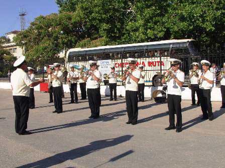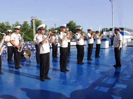 港に着いた客船を歓迎する軍楽隊。接岸しようとする桟橋に“先客”の船がいるときには、歓迎する人たちはその“先客”のデッキに上がってそこで演奏することになる。 (2003年8月撮影)