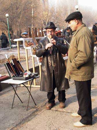 エレヴァン中心部で開かれた青空市場で商品の縦笛を吹いて見せる露天商。 (2004年12月撮影)