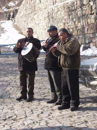 エレヴァン郊外のゲガルト修道院前の駐車場で観光客が着くたびに“歓迎”の民族音楽を奏でる男性三人組。 (2004年12月撮影)