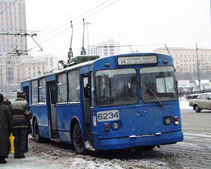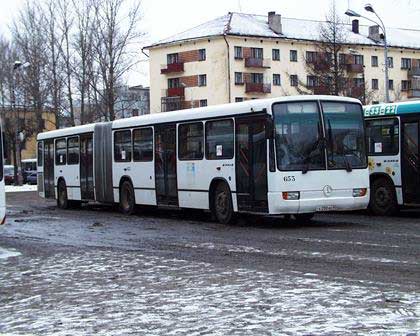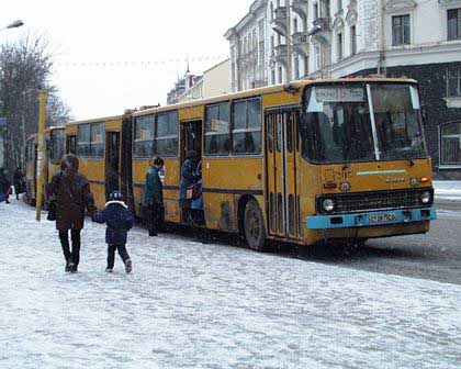 バスは大都市ばかりでなく中小の都市にも路線網が縦横に走っているが、軌道や架線がないだけにしばしばルートや停留所が変更になるので、地元の人間でない我々が使う時には注意が必要。写真のような二連式のバスは日本ではどこかの万博の時に使用されて話題になったが、あちらではごく普通に使われている。コストを抑えながら大量の乗客を運ぶという点で効率的だが日本のように道路事情の極端に良くないところには確かに不向きかもしれない。 (1999年12月プスコフで撮影)ソ連時代、上の写真のようなハンガリーのイカルス社のバスが全土を席巻していたが、東欧経済圏の崩壊とともに修理部品の供給にも事欠くようになったらしい。ロシアになってからことに地方都市で左の写真のようなメルセデス社製のバスを多く見かけるようになった。ロシアで日本車を見るのは珍しくないが、ことバスに関しては見たことがない。おそらく乗降口が左右逆だからであろう。 (1999年12月プスコフで撮影)