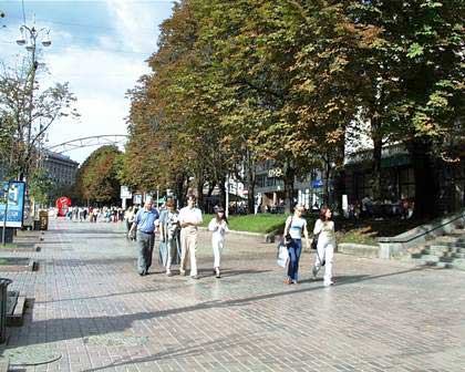 キエフのメイン・ストリートであるフレシャチク大通りの歩道。自動車が通れるくらいの広い幅だ。写真右手の街路樹の向こう側も一段高い歩道になっていて、そこには散歩の途中でひと休みできる椅子が置かれたりしている。 (2003年8月撮影)