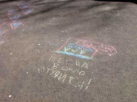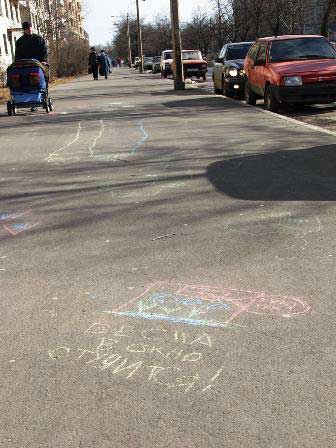 写真は、ペテルブルクのワシーリー島の西端に近い住宅街の歩道で見つけた落書き。「春が窓をコツコツとたたく」とあって、自作のものか学校で暗誦させられたものか知らないが、子どもたちが石墨か白墨でこんな詩的な落書きをするなんて、この国の教育の深みをあらためて知らされたように感じた。 (2005年3月撮影)