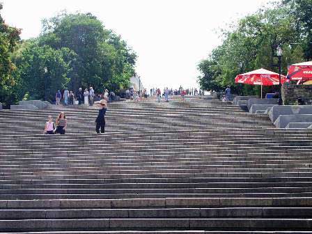 オデッサ港の桟橋から市への入り口にある有名な「ポチョムキンの階段」。オデッサでいちばんの観光名所だ。途中に何ヶ所か踊り場があるのだが、こうやって下からみると踊り場が見えない。 (2003年8月撮影)