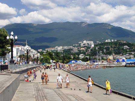 ヤルタ港の遊歩道。優雅なデザインの街路灯の列の左手、ちょっと高いところもやはり幅広のプロムナードになっている。夏の季節、地元の人たちに多くの観光客も加わって混雑するのは横浜の山下公園と同じ。 (2003年8月撮影)