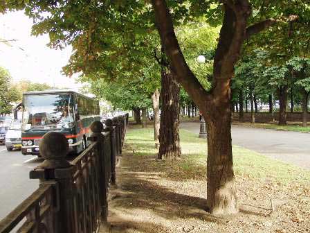鉄製の柵の右側が中央分離帯で、道路の左右にある歩道とは別にここにものんびりと歩ける広い歩道がある。反対方向へ向かう車線は、写真の画面に入れきれないはるか右側だ。 (2003年8月撮影)