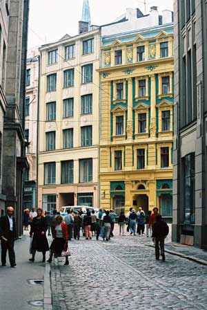 朝の舗道。太陽の高さが高くないので、建物の影が道を覆う。 (2005年8月撮影)