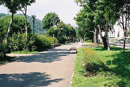 ペトロパヴロフスク・カムチャツキーの町では海に面した急斜面に海岸と平行な向きに何本もの大通りが高さを違えて走っている。そのためにどの道も海側からの光を浴びて明るい。歩道の幅が広く、しかもこの道では植え込みによって自動車道と隔てられているので海を眺めながらゆったりと散歩しようという気分になる。 (2000年8月撮影)