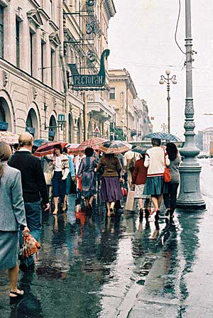 ネフスキー通り中心部の歩道。雨の日は雨の日で情緒がある。(1985年8月撮影)