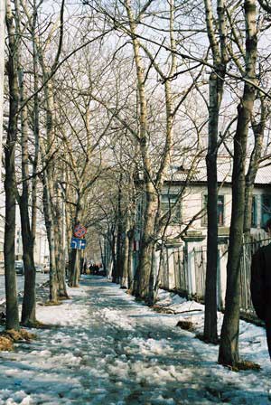 北国ながら太陽の明るさが春をじゅうぶんに感じさせる。また、これらの並木に全部緑の葉が繁ったらと想像するとその季節にもまた是非訪れてみたいという気がする。 (1998年3月撮影)