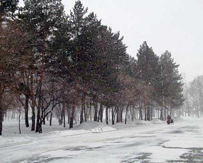 市の中心からアムール河畔に向かう遊歩道。春だというのに強い雪が降っていた。 (2001年3月撮影)