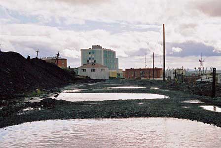 ドゥヂンカの町のはずれ、エニセイ川に面した貯炭場の脇の未舗装道路。雨上がりで、道に水たまりがあるというより、水面からところどころ道路が顔を出していると言ったほうがあたっている? (1999年8月撮影)