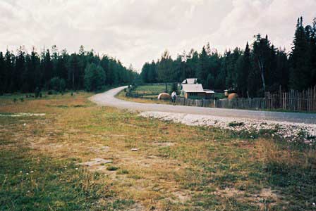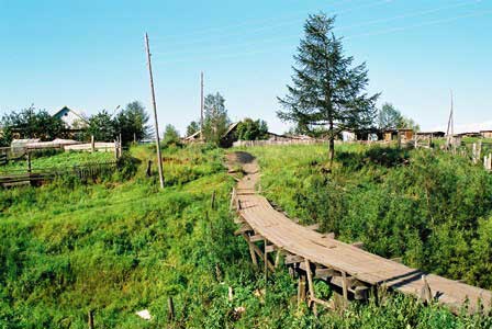 そのトゥルハンスク村の小さな川を渡る橋とその先の道。橋も曲がっているし、電柱は傾いているし、気のせいか立ち木もかしいでいるようで、まっすぐなものを見つけるほうが難しい。(1999年8月撮影)