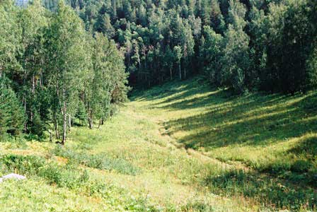 シベリアのタイガをを切り開いて続くひとすじの小径。地元の人が茸取りをしたりするだけに使うけもの道のようなものだけではないことは、轍のあとがあることからうかがえる。 (1999年8月撮影)