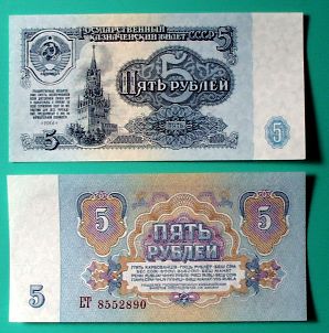 ソ連時代末期に流通していた紙幣のうち、金額的に使い勝手の良かった5ルーブルの紙幣。日本のものにくらべて小ぶりなのが特徴だった。また一旦市中に出回ったら簡単には回収しないのか、しわくちゃで汚いものが多かったという印象もある。写真のような新券は入国した空港で両替する時ぐらいにしか手に入らなかった。