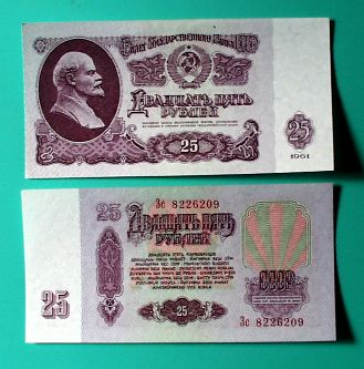 比較的高額の25ルーブル紙幣。このくらいの額になってレーニンの肖像が登場。私が初めてソ連に渡ったときの1ルーブルは1ドルよりも高額でたしか400円ぐらいの公式レートであったから、当時なら左の紙幣は日本の1万円札に相当することになる。